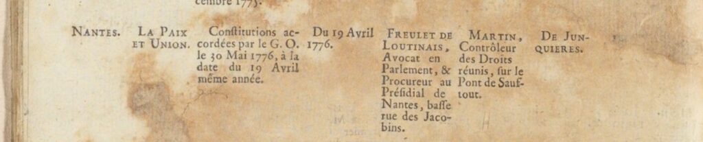 Au moment de l’allumage des ses feux, le 22 mars 1776, de la loge Paix et Union, Nantes est l’un des principaux ports du royaume de France. Ville ouverte sur l’Atlantique, elle connaît un essor considérable grâce au commerce maritime, notamment colonial. Cet essor repose en partie sur la traite atlantique, dont Nantes fut le premier port négrier français au XVIIIᵉ siècle. Cette réalité historique, aujourd’hui pleinement reconnue, s’inscrit dans un système économique et social qui a profondément marqué la ville, ses élites et ses réseaux. C’est dans ce contexte complexe, mêlant prospérité, circulations intellectuelles et contradictions morales, qu’émerge une bourgeoisie éclairée, constituée de négociants, d’armateurs, de juristes, d’hommes de lettres, particulièrement réceptive aux idées nouvelles diffusées par le mouvement des Lumières.